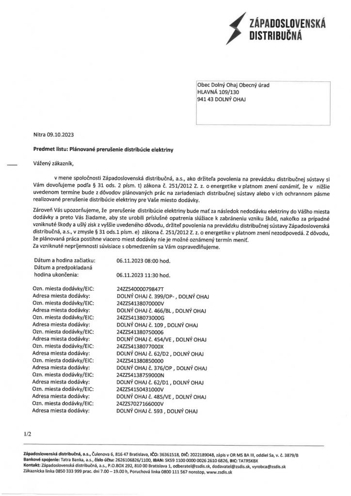 Prijímateľ: Obec Dolný Ohaj, Hlavná 109/130,941 43 Dolný Ohaj